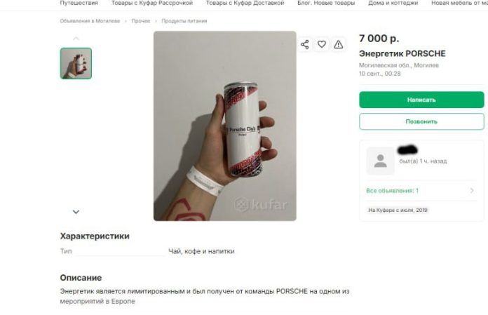 В объявлении указано, что энергетик является лимитированным и был получен от команды PORSCHE на одном из мероприятий в Европе. Владелец готов продать баночку напитка как коллекционерам, так и обычному человеку, который хотел бы попробовать энергетик. При этом в тексте объявления он отметил, что товар возврату не подлежит.